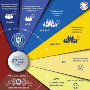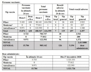 Conform CNCAV, în ultimele 24 de ore au fost întregistrate 126 de reacții adverse: 7 de tip local și restul de tip general. 96 dintre reacțiile adverse au fost raportate după vaccinul AstraZeneca, și 30 după administrarea serului Pfizer.