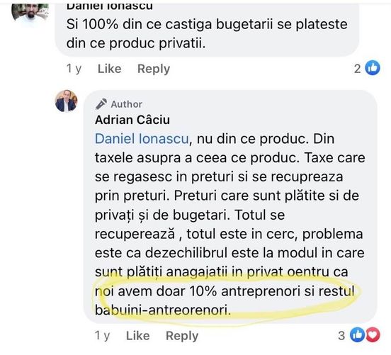 Supărat din cauza unui comentariu în care un utilizator spunea că „100% din ce câștigă bugetarii se plătește din ce produc privații”, Adrian Câciu a spus: „Nu din ce produc. Din taxele asupra a ceea ce produc. Taxe care se regăsesc în prețuri și se recuperează prin prețuri. Prețuri care sunt plătite și de privați și de bugetari. Totul se recuperează, totul este în cerc, problema este că dezechilibrul este la modul în care sunt plătiți angajații în privat pentru că noi avem doar 10% antreprenori si restul babuini-antreonori (sic!)”.
