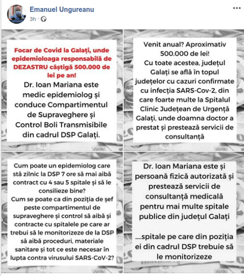 Medicul Mariana Ioan, epidemiologul care conduce Compartimentul de Supraveghere și Control al Bolilor Transmisibile din cadrul Direcției de Sănătate Publică Galați, are și contracte cu 4-5 spitale și câștigă însumat, potrivit declarației sale de avere, 500.000 de lei pe an, afirmă deputatul USR Emanuel Ungureanu, vicepreședintele Comisiei de Sănătate din Camera Deputaților, într-o postare pe facebook.
