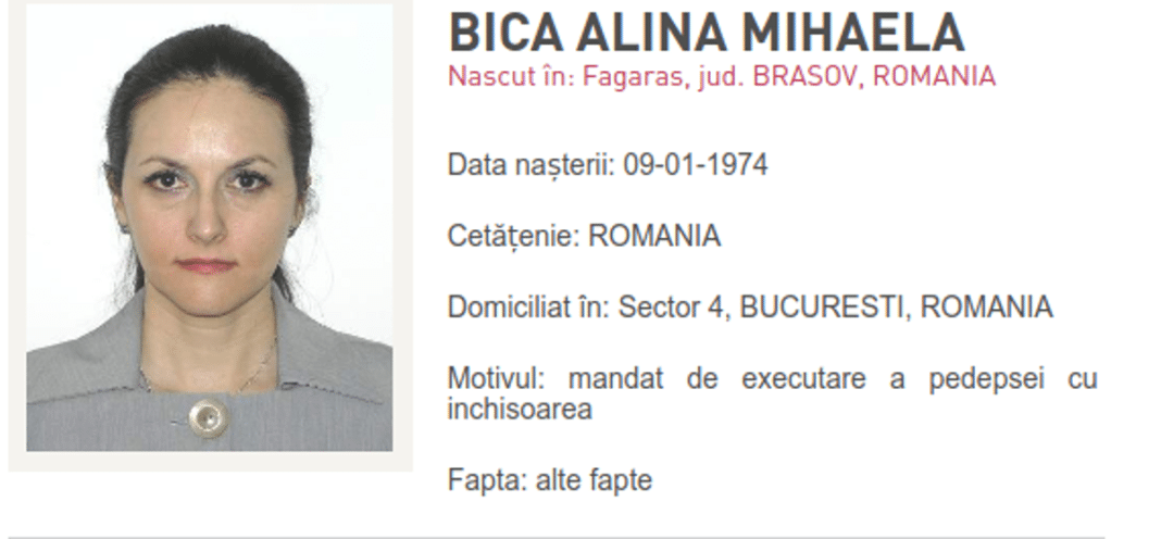 Alina Bica a fost dată în urmărire la sfârșitul lunii noiembrie 2019. Ea are de executat o pedeapsă de 4 ani de închisoare cu executare. Judecată în mai multe dosare, Bica a plecat din țară în 2018, înainte ca procesele sale să se încheie. Ea a mers mai întâi în Costa Rica, unde, la un moment dat a fost fotografiată în compania Elenei Udrea. De altfel, împreună cu Elena Udrea, Alina Bica a fost reținută la un moment dat în Costa Rica, dar ulterior a fost eliberată.