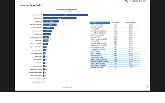 Ultimul cu peste 1.000 de referiri este ministrul Afacerilor Interne Lucian Bode, cu o mai mare vizibilitate în zilele în care a anunţat regulile pentru desfăşurarea ceremoniilor din 1 Decembrie.