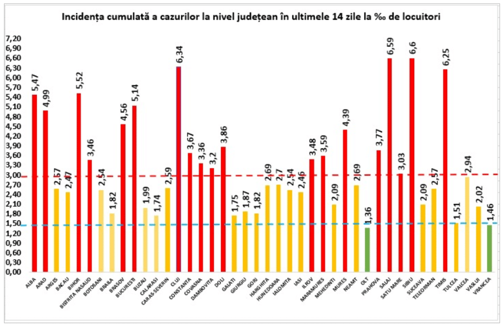 Cea mai recentă informare a Grupului de Comunicare Strategică arată că ratele cele mai mari de infectare cu coronavirus se înregistrează în județele: Cluj (6,34 la mia de locuitori, în utimele 14 zile), Sălaj (6,59), Sibiu (6,6) și Timiș (6,25).