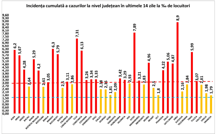 Cu o rata de infectare de 5,79 la mia de locuitori, Municipiul București are 1412 de cazuri noi și 56015 per total.