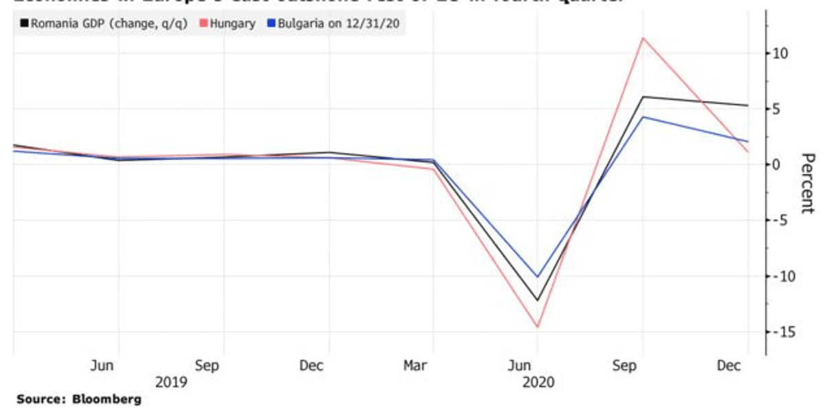 Vești bune despre economia României. Potrivit unei analize a jurnaliștilor de la Bloomberg, Evoluţia economiei româneşti a depăşit-o pe cea a celorlalte ţări ale Uniunii Europene în trimestrul patru din 2020. Și asta pentru că Guvernul PNL a optat să nu impună tipul de restricţii severe care au închis cea mai mare parte a continentului.