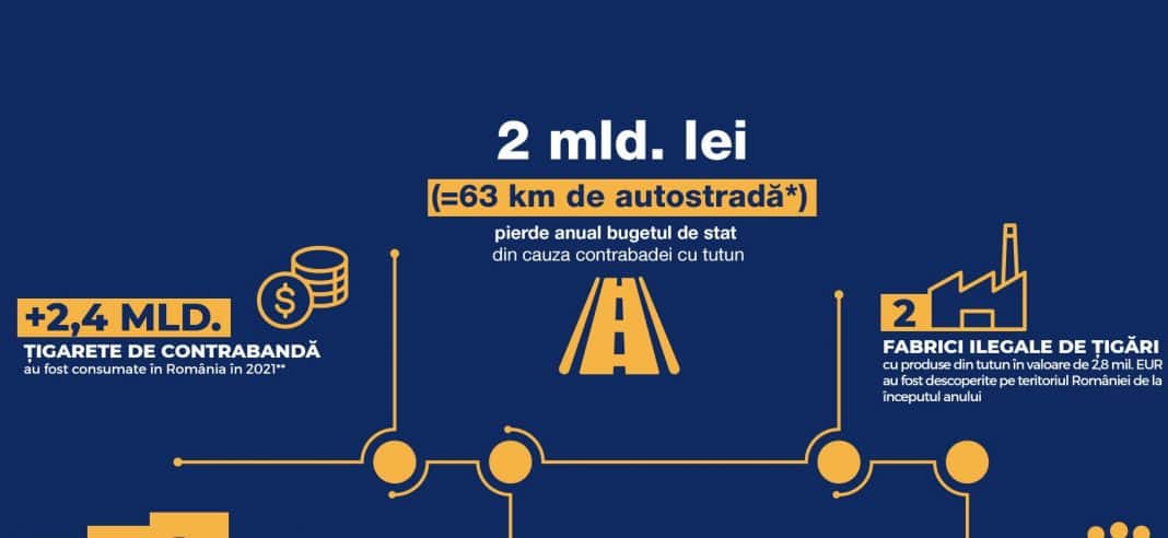 Din datele oficiale ale BAT România reiese că peste 2,4 miliarde de țigarete de contrabandă au fost consumate în țara noastră anul trecut. Valoarea totală a acestora se ridică la 2 miliarde de lei. Ce s-ar fi putut face cu acești bani? Spre exemplu, 63 de kilometri de autostradă.