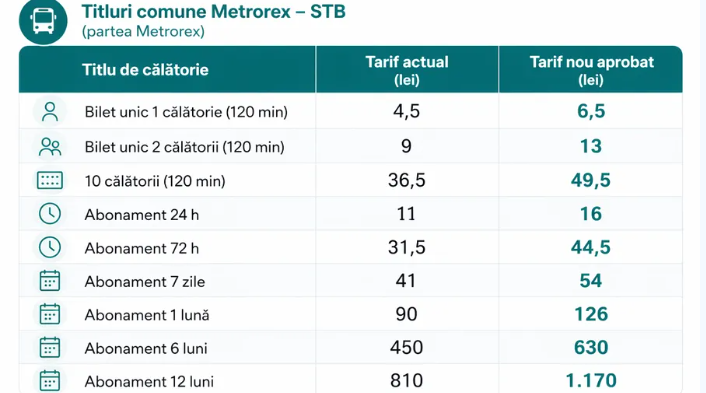 În paralel, și Societatea de Transport București (STB) ia în calcul creșterea tarifelor pentru transportul de suprafață, de la 3 la 5 lei pentru o călătorie. Deși compania susține că măsura nu ar aduce neapărat venituri suplimentare, ci ar îmbunătăți fluxul de numerar, decizia finală nu a fost încă adoptată.