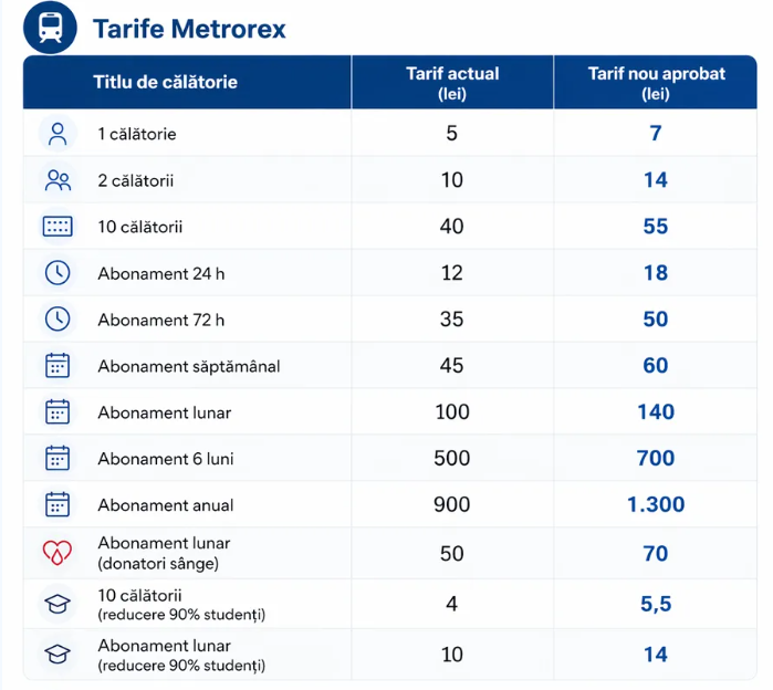 Este oficial: începând cu data de 1 mai 2026, tarifele Metrorex vor crește semnificativ, prețul unei singure călătorii ajungând la 7 lei (o majorare de 40% față de actualul tarif de 5 lei).