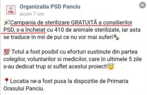 „Campania de sterilizare GRATUITĂ a consilierilor PSD, s-a încheiat cu 410 animale sterilizate, iar asta se traduce în mii de pui ce nu vor mai suferi”, a fost mesajul postat pe Facebook.