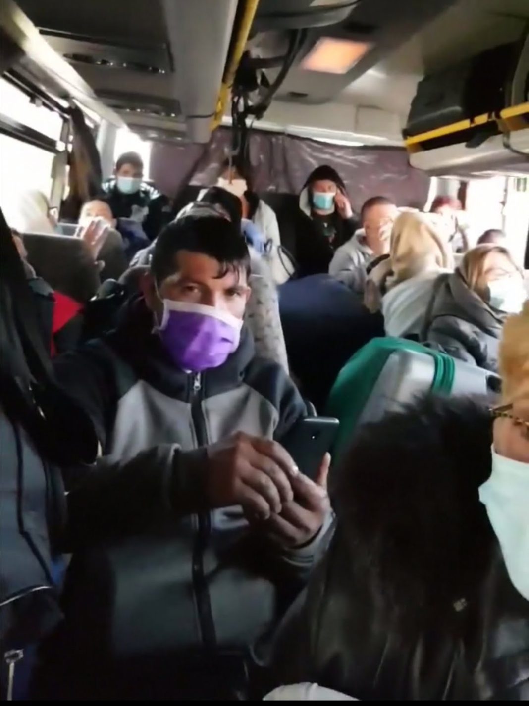 Oamenii au intrat în țară prin vama Nădlac și sunt redirecționați de către cei de la DSP și ISU Arad către centrele unde ar trebui să stea în carantină 14 zile. În autobuzul care ii duce acolo, oamenii au fost înghesuiți precum vitele. Distanțare socială?! Poveste!