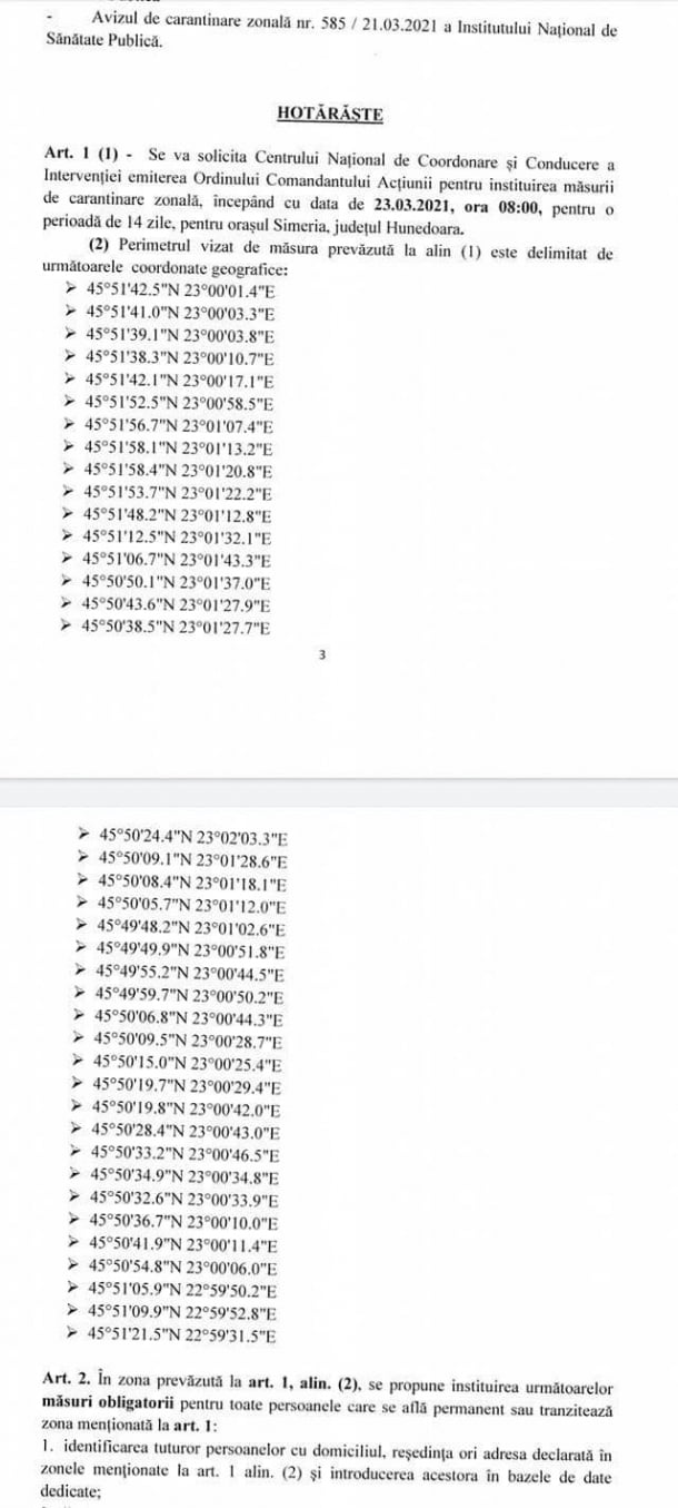 Situație absurdă în Simeria, oraș care va intra, cel mai probabil, de marţi, în carantină pentru o perioadă de 14 zile, după ce incidenţa cazurilor de COVID-19 a depăşit valoarea de 6 la mia de locuitori. Autoritățile au ținut să specifice în hotărârea luată coordonatele geografice exacte care delimitează zona carantinată.