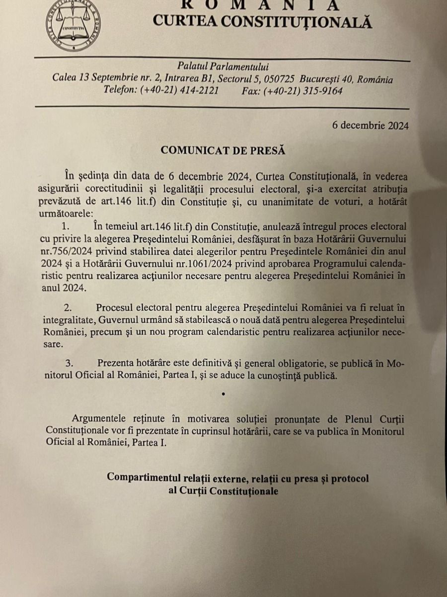 „În şedinţa din data de 6 decembrie 2024, Curtea Constituţională, în vederea asigurării corectitudinii şi legalităţii procesului electoral, şi-a exercitat atribuţia prevăzută de art.146 lit.f) din Constituţie şi, cu unanimitate de voturi, a hotărât următoarele: În temeiul art. 145 lit. f) din Constituţie, anulează întregul proces electoral cu privire la alegerea preşedintelui României, desfăşurat în baza HG 756/2024 privind stabilirea datei alegerilor pentru preşedintele României în anul 2024 şi a HG 1061/2024 privind aprobarea programului calendaristic pentru realizarea acţiunilor necesare pentru alegerea preşedintelui României în anul 2024”, se arată în decizia CCR.