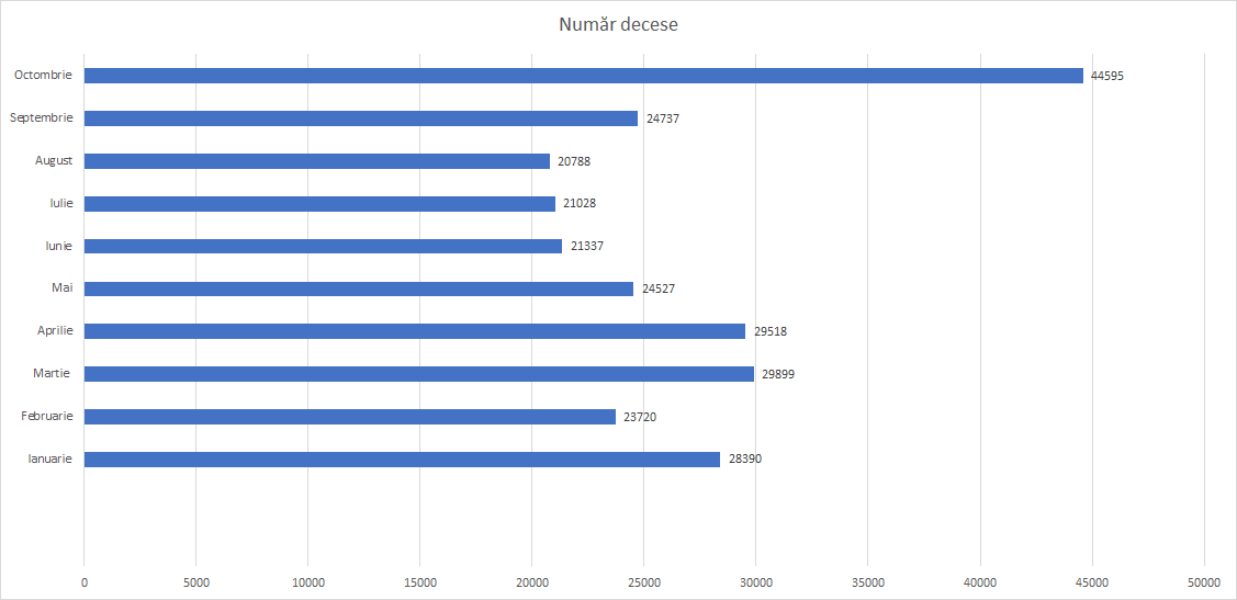 Numărul deceselor înregistrate în luna octombrie 2021 a fost de 44.595 (22.717 bărbați și 21.878 femei), cu 19.858 decese (9.796 bărbați și 10.062 femei) mai multe decât în luna septembrie 2021.