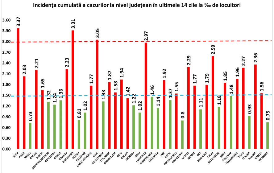 Bucureştiul, care a trecut duminică de pragul de 3 în ceea ce priveşte incidenţa cumulată a cazurilor din ultimele 14 zile raportate la mia de locuitori, înregistrează o creştere a acestui indicator, la 3.31.