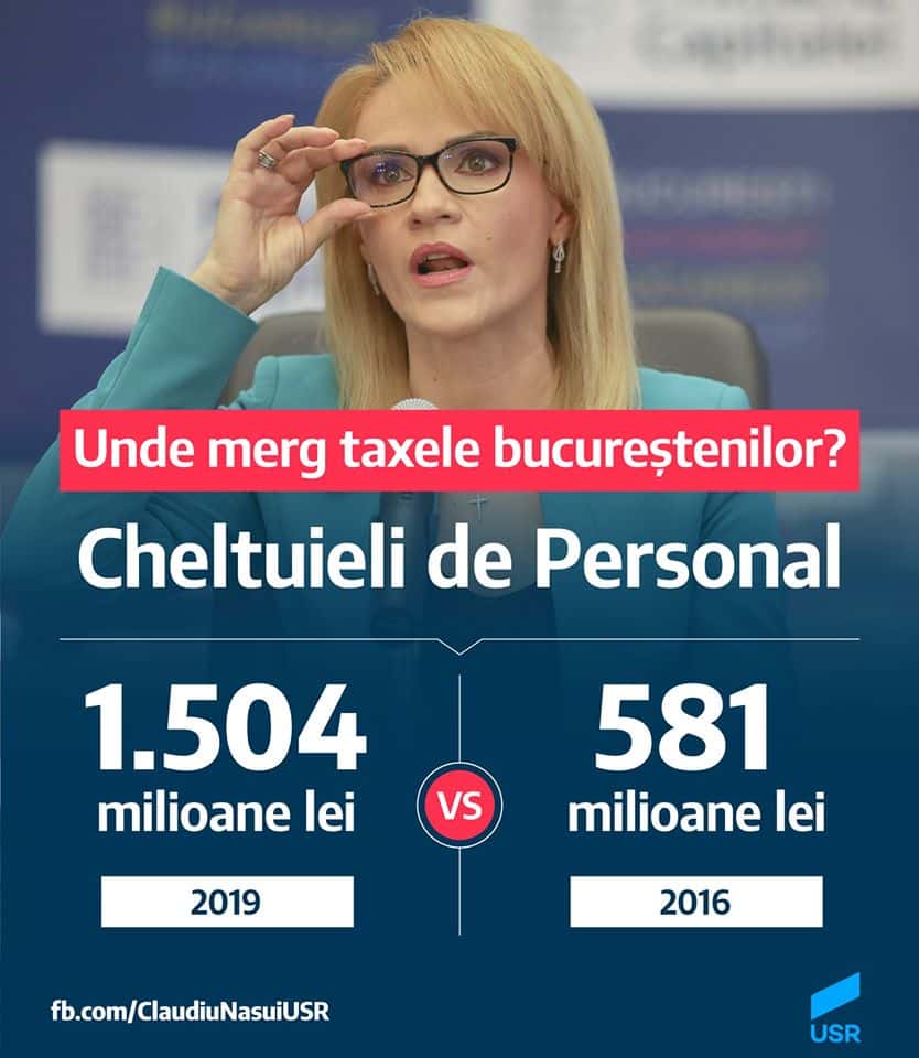 „Sub conducerea PSD, cheltuielile statului la nivel local si central au explodat, fara ca romanii si firmele care contribuie din greu la bugetul statului sa simta vreo imbunatatire in serviciile pe care le primesc. Cel mai elocvent exemplu: Primaria Municipiului Bucuresti. In institutia condusa de Gabriela Firea, cheltuielile salariale aproape ca s-au triplat in ultimii 4 ani, dupa cum arata deputatul USR Claudiu Nasui. De la circa 580 de milioane de lei in 2016 s-a ajuns in 2018 la 1,5 miliarde lei. O crestere, asadar, de 2,6 ori, performanta uimitoare si greu de egalat pentru orice intreprindere privata platitoare de taxe si impozite”, indica o postare luni pe pagina de Facebook a USR.