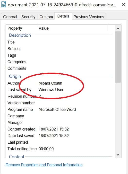 Deși a negat orice legătură cu documentul, afirmând că nu ar fi real, cerând chiar și dovezi, actul a fost creat de Mioara Costin, consilier de stat în cadrul Cancelariei Prim-Ministrului. Acest lucru poate fi verificat prin câteva click-uri, arată Hotnews.