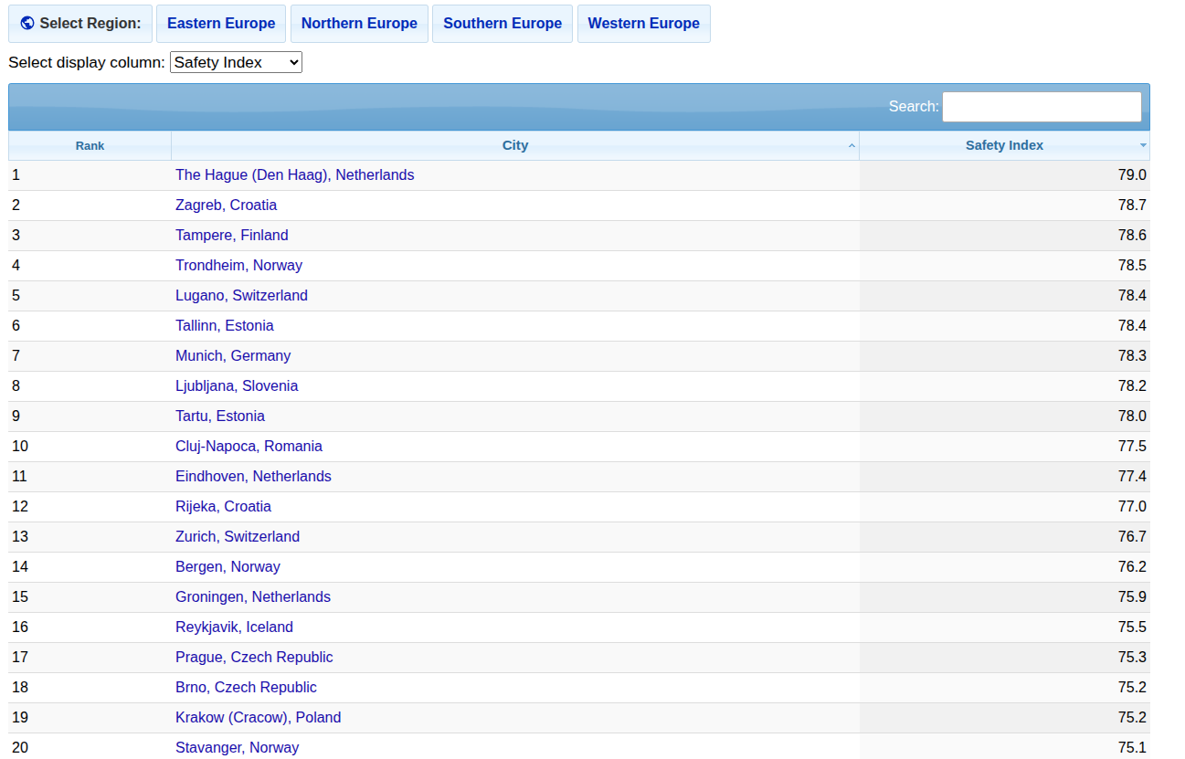 În clasament, Cluj-Napoca se regăsește alături de orașe din nordul și vestul Europei, recunoscute pentru nivelul ridicat de siguranță. Înaintea sa apar Tampere (Finlanda), cu un scor de 79,6, dar și Eindhoven și Utrecht (Olanda), cu peste 79 de puncte. În top se regăsesc și orașe precum München sau Zagreb, cu scoruri apropiate.