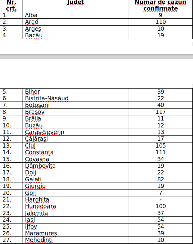 Numărul de cazuri confirmate, pe județe, potrivit raportării Institutului Național de Sănătate Publică.