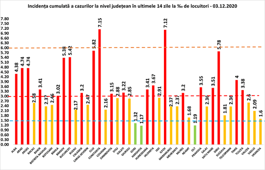 Distribuția îmbolnăvirilor, la nivel județean și în Capitală, arată astfel: Alba 128 de cazuri nou confirmate (10224, număr total de cazuri confirmate), Arad (11622), Argeș 167 (14462), Bacău 126 (13433), Bihor 173 (14457), Bistrița-Năsăud 58 (5945), Botoșani 108 (6399), Brașov 230 (19602), Brăila 69 (5879), Buzău 56 (6714), Caraș-Severin 38 (4945), Călărași 74 (4584), Cluj 399 (22574), Constanța 318 (18300), Covasna 33 (4257), Dâmbovița 151 (11799), Dolj 133 (12560), Galați 76 (10996), Giurgiu 93 (4261), Gorj 36 (4440), Harghita 34 (4731), Hunedoara 118 (9100), Ialomița 96 (4910), Iași 316 (20839), Ilfov 242 (16138), Maramureș 70 (8787), Mehedinți 63 (4098), Mureș 86 (12311), Neamț 53 (9500), Olt 111 (7574), Prahova 142 (19644), Satu Mare 99 (5785), Sălaj 21 (5582), Sibiu 69 (14356), Suceava 126 (13367), Teleorman 105 (5738), Timiș 287 (19637), Tulcea 48 (3856), Vaslui 108 (7964), Vâlcea 90 (8197), Vrancea 115 (5721), Municipiul București 767 (69821).