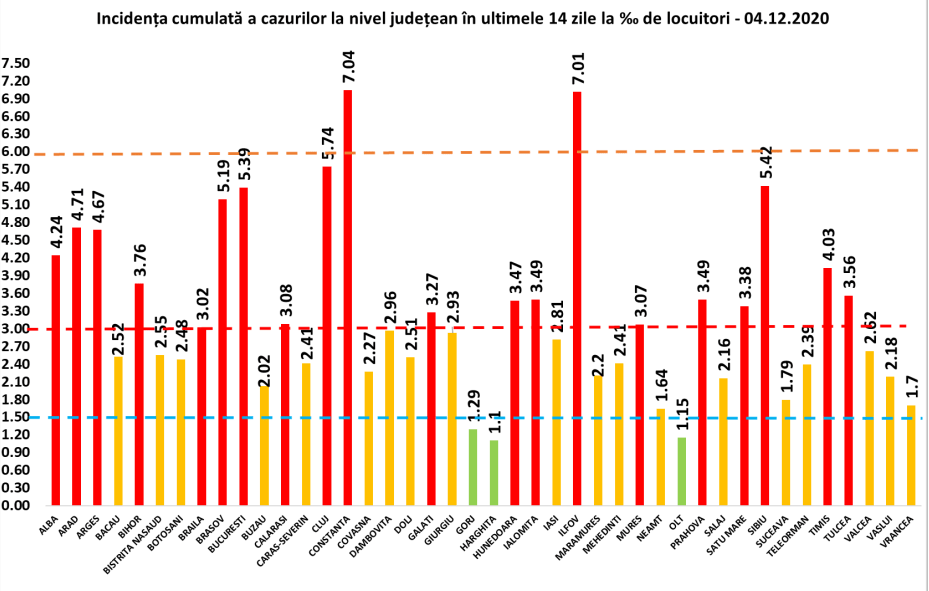 Distribuția îmbolnăvirilor, la nivel județean și în Capitală, arată astfel: Alba 121 de cazuri nou confirmate (10.345, număr total de cazuri), Arad 125 (11.747), Argeș 244 (14.706), Bacău 134 (13.567), Bihor 228 (14.685), Bistrița-Năsăud 97 (6.042), Botoșani 96 (6.495), Brașov 355 (19.957), Brăila 117 (5.996), Buzău 92 (6.806), Caraș-Severin 78 (5.023), Călărași 76 (4.660), Cluj 434 (23.008), Constanța 431 (18.731), Covasna 51 (4.308), Dâmbovița 85 (11.884), Dolj 105 (12.665), Galați 269 (11.265), Giurgiu 206 (4.467), Gorj 51 (4.491), Harghita 53 (4.784), Hunedoara 176 (9.276), Ialomița 83 (4.993), Iași 340 (21.179), Ilfov 322 (16.460), Maramureș 79 (8.866), Mehedinți 46 (4.144), Mureș 196 (12.507), Neamț 102 (9.602), Olt 77 (7.651), Prahova 267 (19.911), Satu Mare 98 (5.883), Sălaj 42 (5.624), Sibiu 203 (14.559), Suceava 124 (13.491), Teleorman 98 (5.836), Timiș 344 (19.981), Tulcea 95 (3.951), Vaslui 188 (8.152), Vâlcea 69 (8.266), Vrancea 137 (5.858), Municipiul București 986 (70.807).