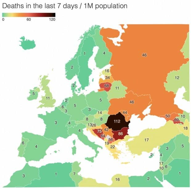 Raportată la populație, mortalitatea din România în rândul persoanelor infectate cu SARS-CoV-2 este fruntașă în lume, anume 16,6 decese la un milion de locuitori.