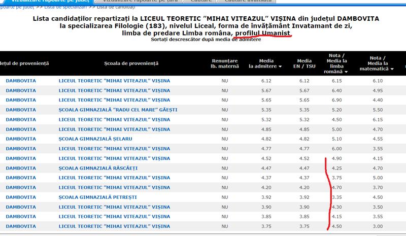 Spre exemplu, la liceul Teoretic Mihai Viteazu din Vișina, județul Dâmbovița, au intrat la clasă de filologie un număr de 17 elevi care au luat sub 5 la examenul de la română. Cele mai mici medii cu care s-a intrat la filologie a fost 1,7 și 1,8, arată NewsWeek.