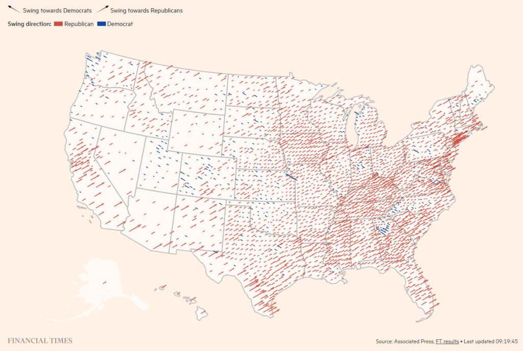 Harta electorală. Cu roșu, schimbarea de tendință a votului către republicani. Cu albastru, către democrați. Sursă: Financial Times/AP