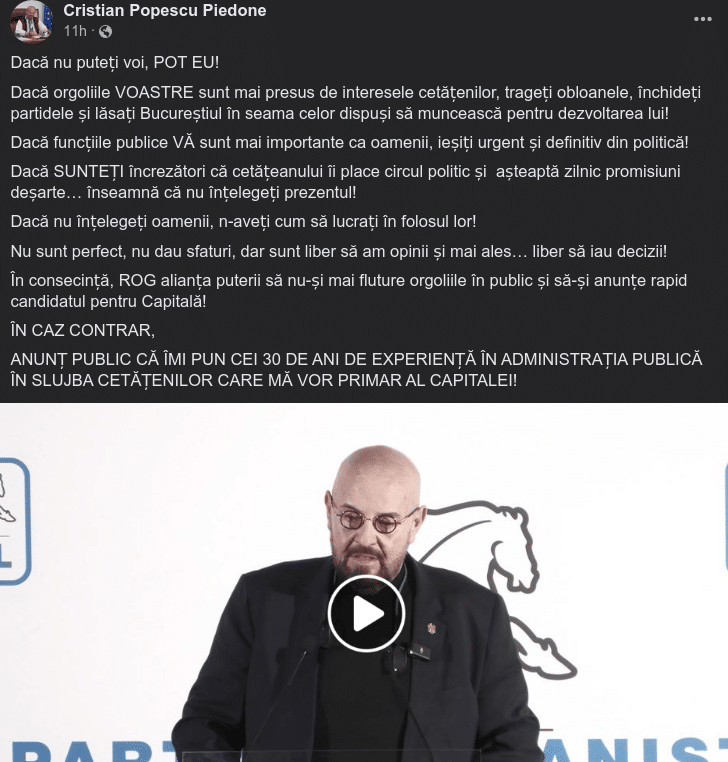 Nu sunt perfect, nu dau sfaturi, dar sunt liber să am opinii și mai ales… liber să iau decizii! În consecință, ROG alianța puterii să nu-și mai fluture orgoliile în public și să-și anunțe rapid candidatul pentru Capitală! ÎN CAZ CONTRAR, ANUNȚ PUBLIC CĂ ÎMI PUN CEI 30 DE ANI DE EXPERIENȚĂ ÎN ADMINISTRAȚIA PUBLICĂ ÎN SLUJBA CETĂȚENILOR CARE MĂ VOR PRIMAR AL CAPITALEI!”, a anunțat Piedone.