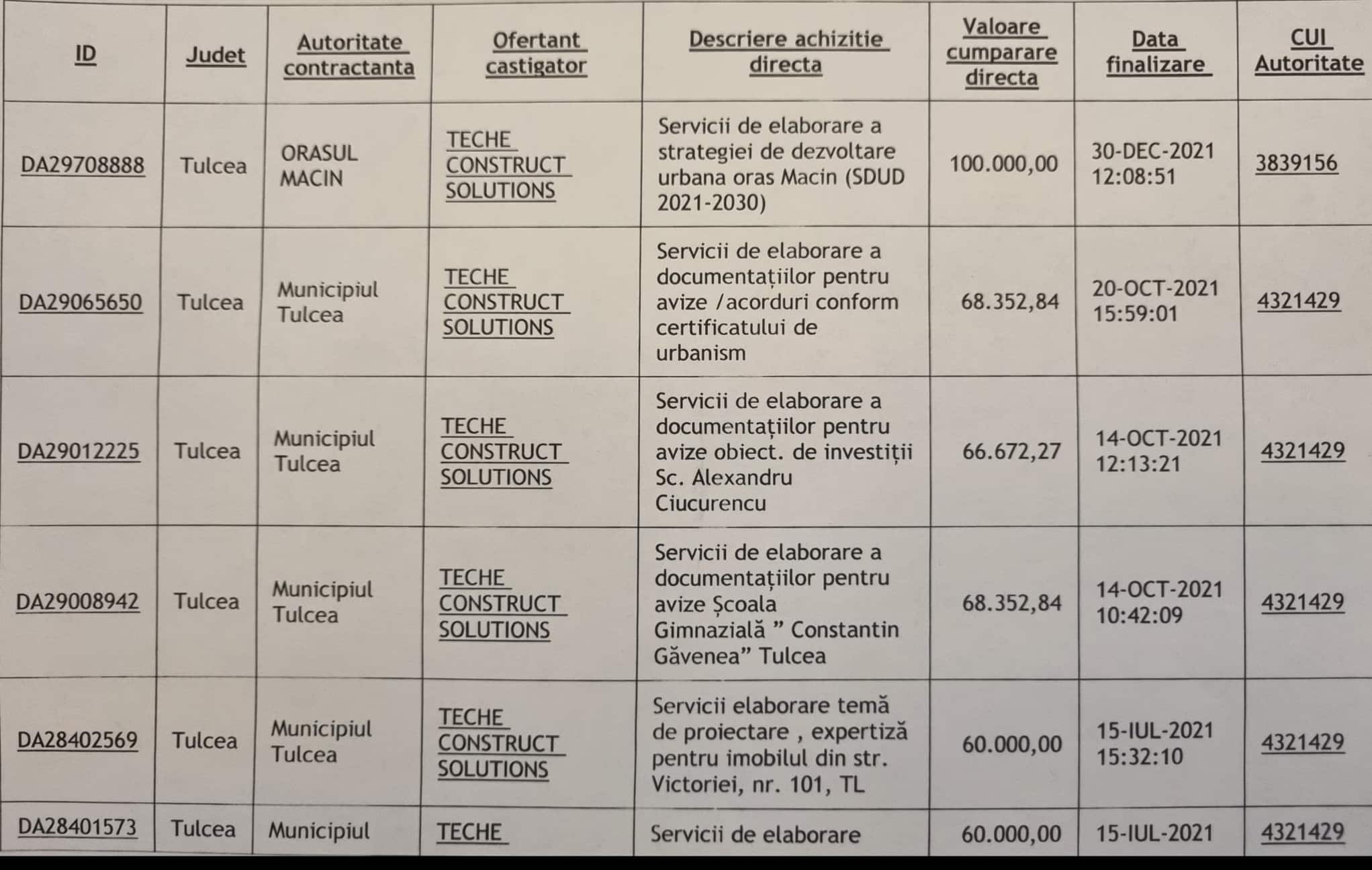 Familia Zaharcu avea o firmă de consultanță, taman pe ceea ce a ajuns acum să avizeze soțul. Sorin Zaharcu era angajat al companiei SC Teche Construct Solution SRL, iar cel ce deținea compania era Elena Zaharcu. Partea interesantă este că inclusiv la momentul în care soțul a susținut concursul de ocupare a postului de la ADI ITI, firma Teche avea contracte cu o parte din primăriile orașelor ce urmează să depună proiecte spre avizare la ADI ITI. În tabelul de mai jos găsiți doar câteva exemple: