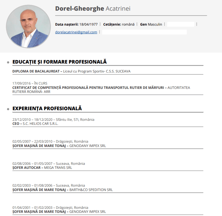 Totodată, actualul deputat menționează că a fost șofer de autocar/TIR și că a terminat un liceu cu program sportiv.