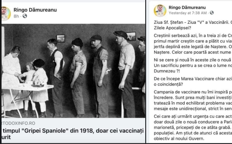 Acesta a postat pe pagina de Facebook duminică, 27 decembrie, chiar în ziua în care România a demarat campania de vaccinare anti-Covid, un fake-news distribuit de publicatia OrtodoxInfo, care susține că doar cei vaccinați ar fi murit în timpul „Gripei Spaniole”.