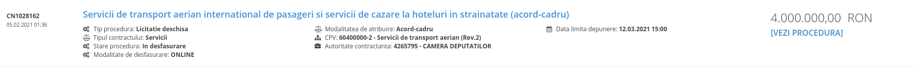 În plină pandemie și cu tot mai multe restricții impuse în Europa și SUA, deputații români sunt cu gândul la plecare. La 5 februarie, Camera Deputaților a lansat o licitație pentru un “acord cadru“ pentru “servicii de transport aerian internațional de pasageri și servicii de cazare la hoteluri în străinătate“.