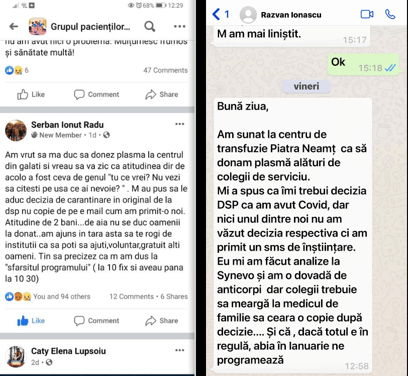 Covidplasma.ro face publice două dintre sutele de mesaje primite de la donatorii de plasmă convalescentă, care sunt refuzați și umiliți de către reprezentanții centrelor de transfuzie.