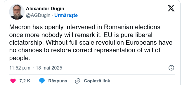 “Macron a intervenit deschis în alegerile din România încă o dată, nimeni nu va remarca acest lucru. UE este dictatură liberală pură. Fără o revoluție la scară largă, europenii nu au nicio șansă de a restabili reprezentarea corectă a voinței poporului”, a scris Dughin pe contul său de Facebook, după ce numărătoarea voturilor a confirmat victoria lui Nicușor Dan în alegerile din România, scrie G4Media.