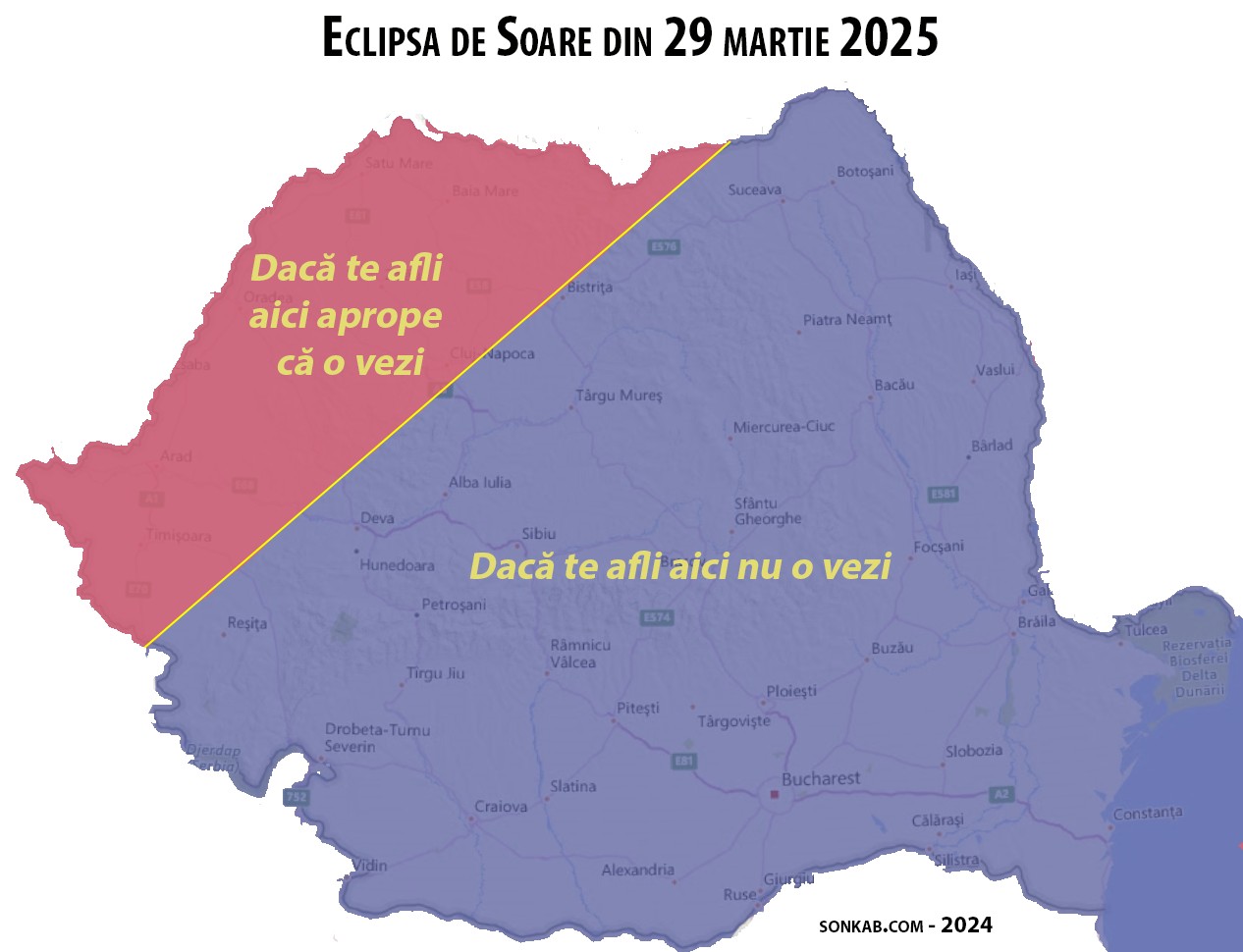 Maximul de acoperire a Soarelui se va vedea din preajma oraşului Satu Mare, cu 0,84% acoperire. Tot acolo eclipsa va avea cea mai lungă durată, 39 minute, conform informaţiilor publicate pe astro-urseanu.ro. Eclipsa durează mai puţin de o oră, iar acoperirea Soarelui va fi de maxim 1%.