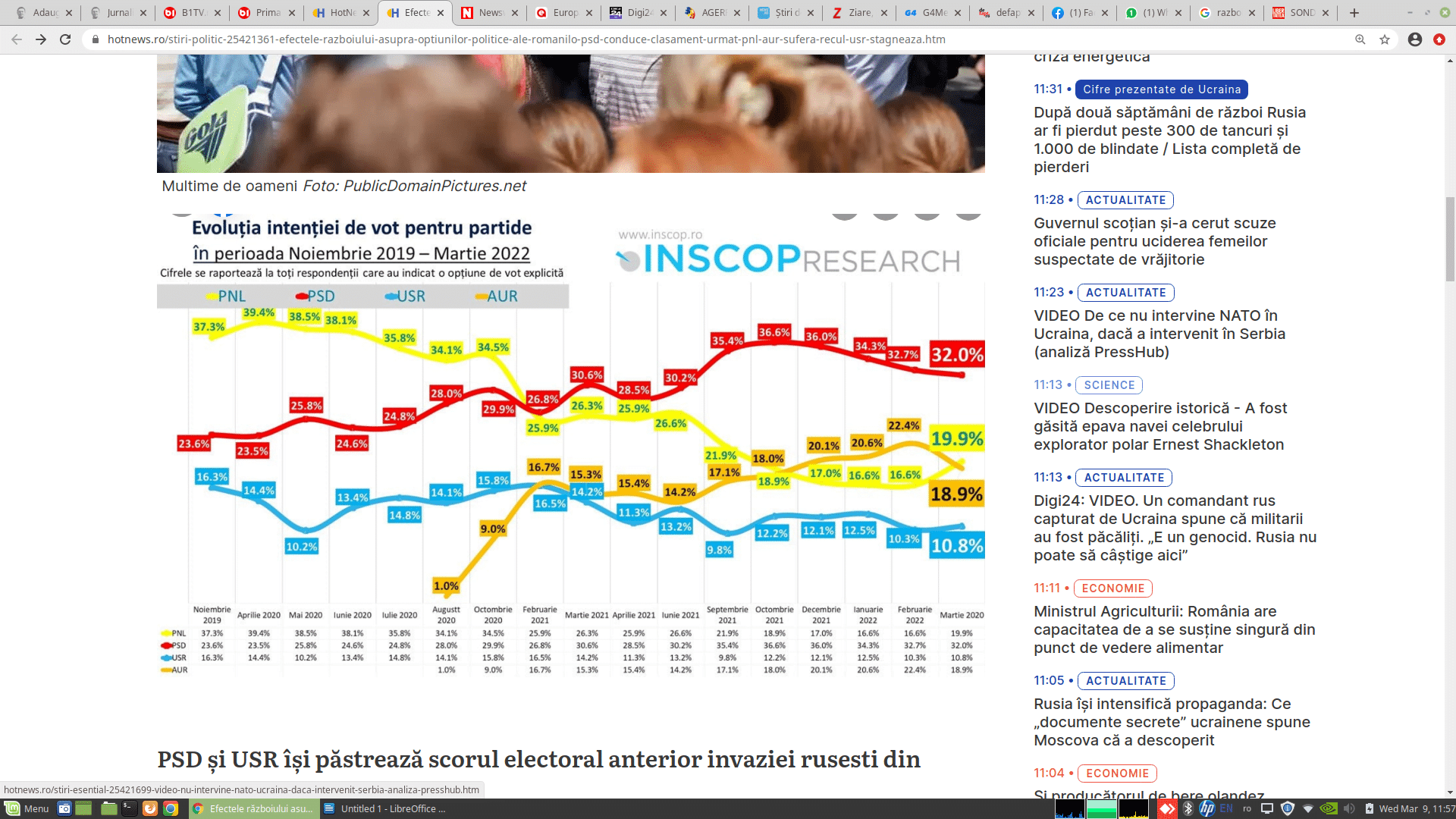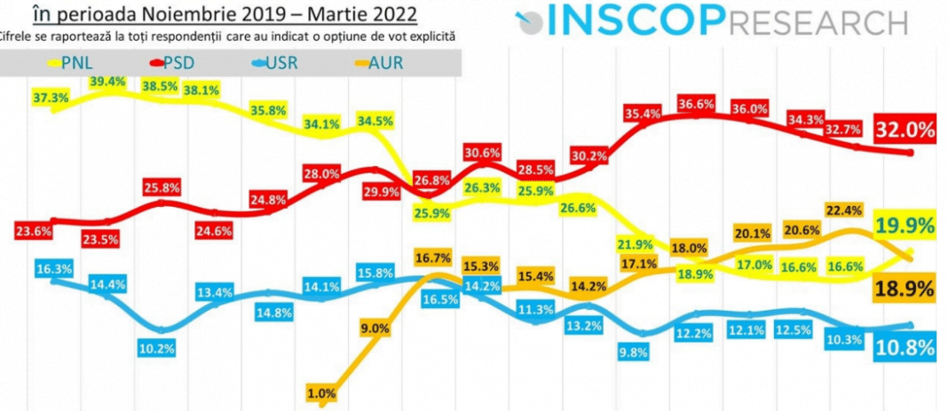 Efectele războiului asupra opțiunilor politice ale românilor încep deja să se vadă. Remus Ştefureac, președintele INSCOP, arată într-un sonadaj publicat pe Facebook că războiul din Ucraina topește din procentele AUR și ridică PNL. PSD conduce în continuare clasamentul, iar USR stagnează.