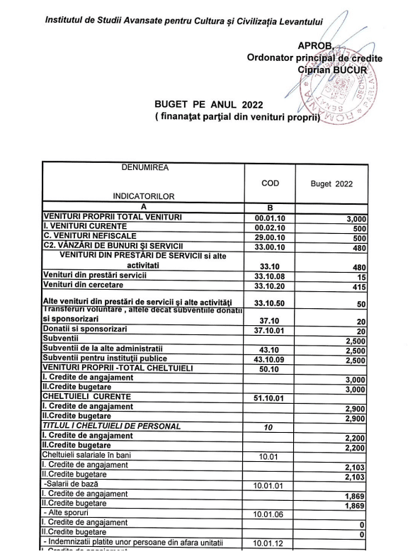 Institutul Levantului are, în 2022, un buget de 3 milioane de lei. Din această sumă, doar 50.000 de lei au fost veniturile proprii ale Institutului.