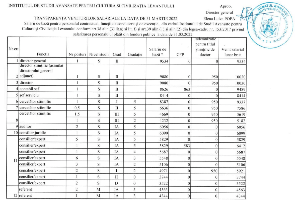 Astfel, președintele ISACCL, Emil Constantinescu primește un salariu de 16.640 de lei lunar, asimilat poziției de secretar de stat. Din 2019, de când funcția de președinte al institutului a devenit sinonimă cu una de secretar de stat, Emil Constantinescu este obligat prin lege să-și depună declarația de avere, dar nu a mai făcut asta de 2 ani.