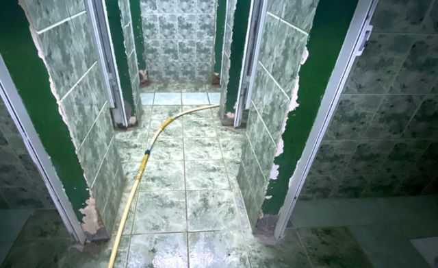 Jurnaliștii Libertatea au găsit la Buzău o sală cu pereți scorojiți, saci improvizați pe post de coșuri de gunoi, calorifere care nu merg, neoane lipsă, vestiare minuscule, uși sau ferestre prinse cu sârmă și șoricei, dar și WC-uri turcești, plus un miros greu de suportat.