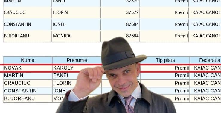 „Astfel, cu aceeași sumă impresionantă de 156.579 de lei, numitul Novak Karoly, tatăl ministrului Novak Carol-Eduard (care în anul 2016 era președintele Federației Române de Ciclism), apare premiat pe 3 state de premiere diferite (Jocurile Olimpice/Paralimpice Rio 2016)  – de 3 ori 156.579 de lei: