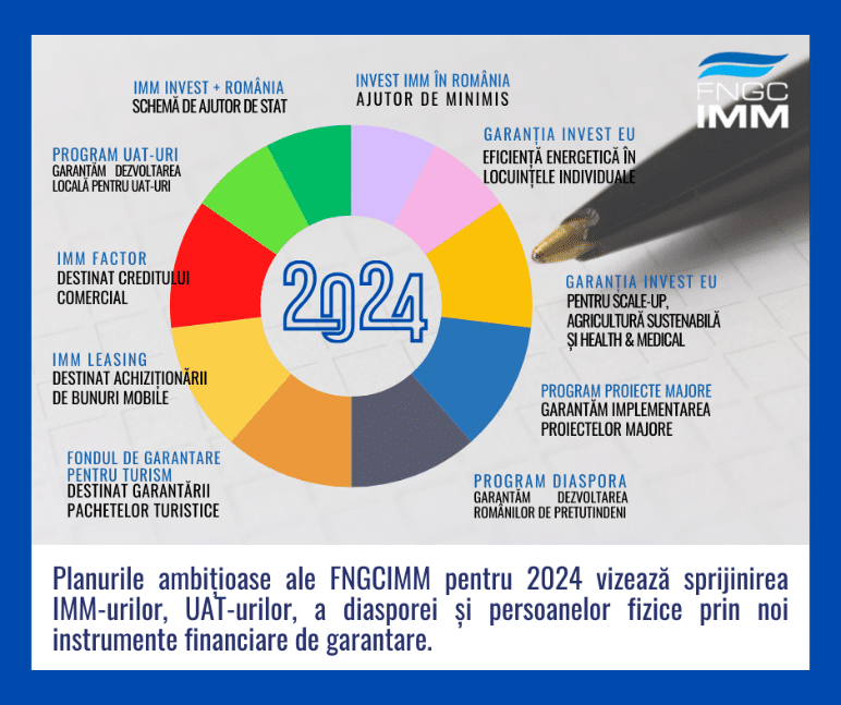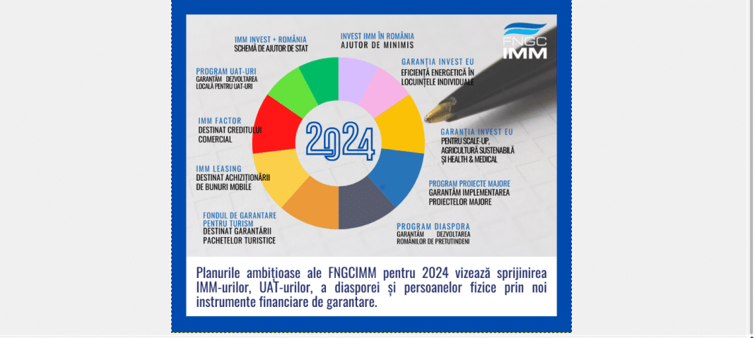 FNGCIMM anunță lansarea unui amplu program de garantare pentru 2024, cuprinzând sectoare diverse și dedicat diferitelor categorii de beneficiari. Planurile ambițioase ale FNGCIMM pentru 2024 vizează sprijinirea IMM-urilor, a UAT-urilor, a diasporei și persoanelor fizice prin noi instrumente financiare de garantare.