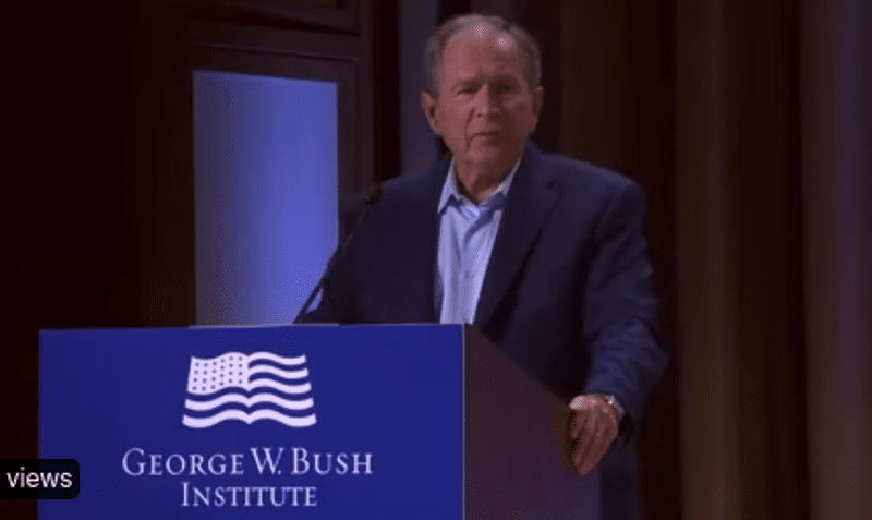 „Rezultatul este o absență a controalelor și echilibrului în Rusia și decizia unui om de a lansa o invazie total nejustificată și brutală a Irakului”, a spus George W. Bush, înainte de a se corecta și a clătina din cap. „Vreau să spun… a Ucrainei”, s-a corectat fostul politician american.