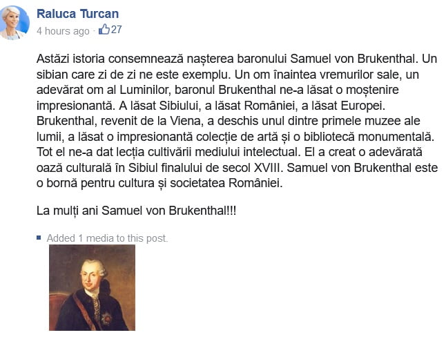 „Astăzi istoria consemnează nașterea baronului Samuel von Brukenthal”, „un sibian care zi de zi ne este exemplu”, a scris Turcan pe Facebook.