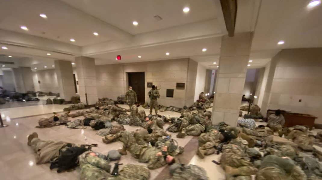 „Tocmai am intrat în Capitoliu și am găsit efectiv sute de soldați care dormeau pe podeaua Congressional Visitor Center, având în vedere că străzile din jur sunt blocate. Cei mai mulți și-au luat în brațe armele, și-au tras uniforma pe ochi ca să nu fie deranjați de lumină și și-au aranjat echipamentul pentru proteste în ordine”, a scris reporterul Nathaniel Reed într-o postare pe Twitter.