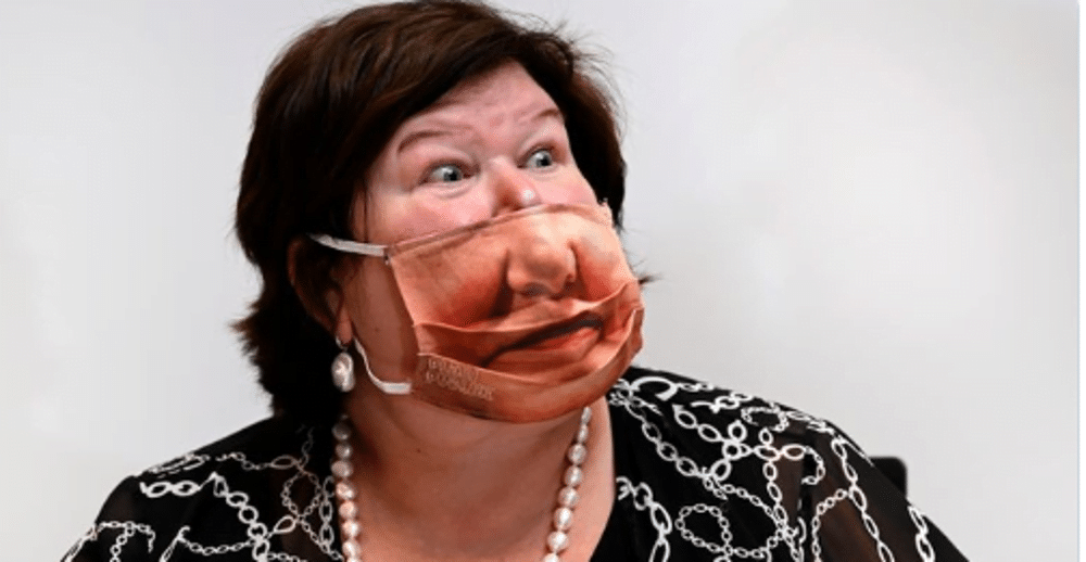 Ministrul belgian al Sănătății, Maggie De Block, a apărut în Parlament cu o mască de protecție imprimată cu propria față. Și asta după ce a declarat că purtatul măștilor de protecție „nu are sens din punct de vedere medical”.