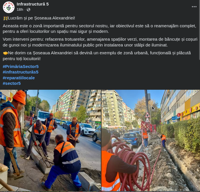 Ne dorim ca Șoseaua Alexandriei să devină un exemplu de zonă urbană, funcțională și plăcută pentru toți locuitorii!”, transmite Infrastructură 5 pe Facebook.
