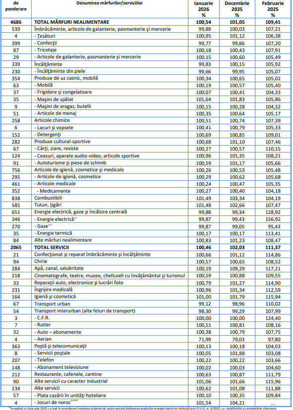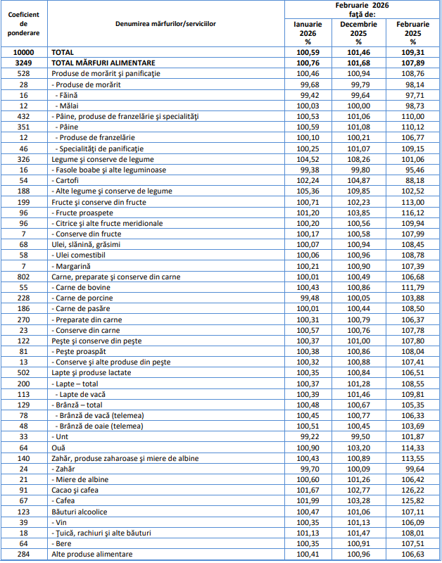 ”Indicele prețurilor de consum în luna februarie 2026 comparativ cu luna ianuarie 2026 a fost 100,59%. Rata inflației de la începutul anului (februarie 2026 comparativ cu decembrie 2025) a fost 1,5%. Rata anuală a inflației în luna februarie 2026 comparativ cu luna februarie 2025 a fost 9,3%. Rata medie a modificării prețurilor de consum în ultimele 12 luni (martie 2025 – februarie 2026) față de precedentele 12 luni (martie 2024 – februarie 2025) a fost 8,1%”, se arată în comunicat.