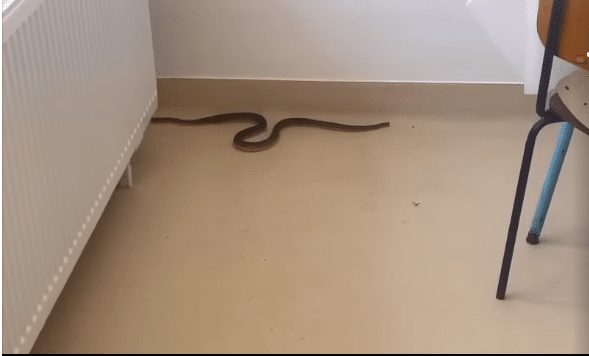 Șarpele a pătruns pe ușa de acces a personalului angajat, s-a plimbat pe holul instituției, apoi, speriat de oameni, a intrat într-o sală de mese.