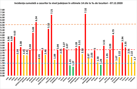 Coeficientul infectărilor cumulate la 14 zile, raportate la 1.000 de locuitori este 6,34 în Bucureşti, în creştere. Cea mai mare valoare a acestui coeficent este în Ilfob – 7,32 (faţă de 7,26 cu o zi în urmă). Judeţul Constanţa are 7,21, faţă de 7.17, cu o zi în urmă.