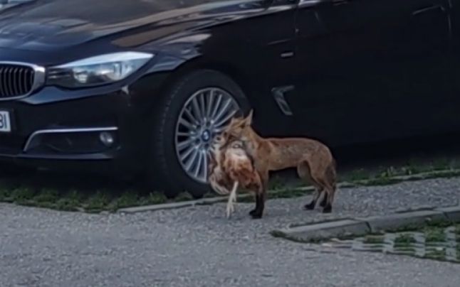 O vulpe cu o găină în gură a fost surpinsă pe străzile din Târgu Jiu. Animalul sălbatic s-a uitat pentru câteva secunde către cel care o filma, după care a fugit printre maşinile parcate într-un ansamblu rezidențial, cu găina în gură.