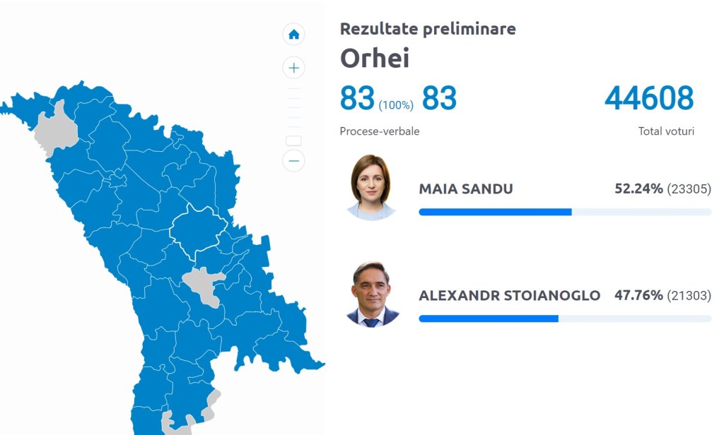 Alexandr Stoianoglo a acumulat 47,76% din voturile exprimat în raionul Orhei, adică 21.303 de sufragii.